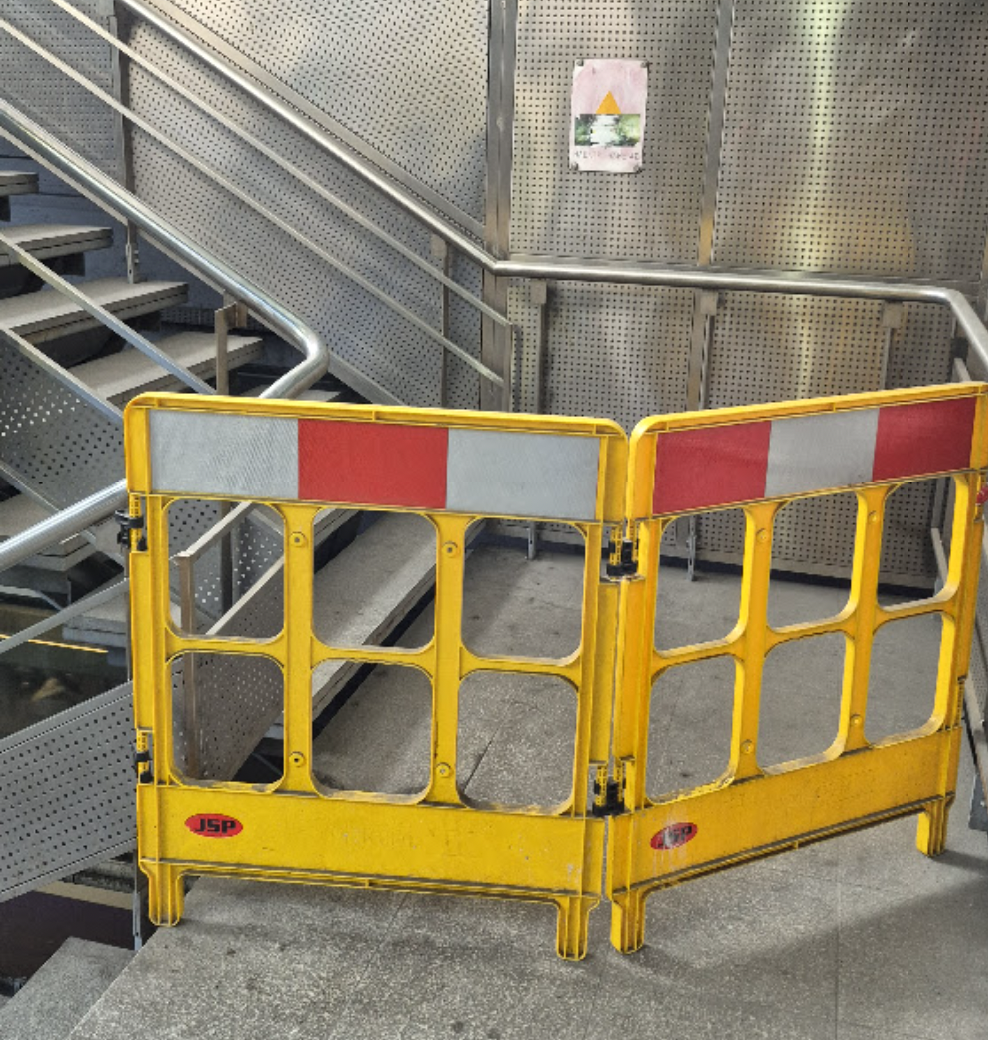Όπως φαίνεται και στις εικόνες, τα μεταλλικά μέρη των κλιμάκων έχουν υποστεί διάβρωση, ενώ δεν είναι λίγα τα σκαλοπάτια που παρουσιάζουν εμφανή κλίση προς τα κάτω, προφανώς λόγω του βάρους των επιβατών που χρησιμοποιούν τις ασυντήρητες εδώ και περίπου 20 χρόνια σκάλες. Επιπλέον, σε αρκετά σκαλοπάτια τμήματα του γρανίτη έχουν σπάσει, αυξάνοντας την επικινδυνότητά τους, ενώ τμήμα της σκάλας από την πλευρά των εκδοτηρίων εισιτηρίων παραμένει κλειστό εδώ και μήνες για τον ίδιο λόγο.