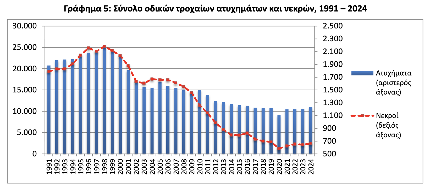 Ιστορικά, σύμφωνα με την ΕΛΣΤΑΤ, o αριθμός των τροχαίων στη χώρα μας έχει σταθεροποιηθεί κατά την τελευταία δεκαετία, ύστερα από αρκετά έτη σημαντικής μείωσης που ξεκίνησε στα τέλη της δεκαετίας του 1990. Παρόμοια τάση μείωσης κατά την τελευταία 30ετία παρατηρείται και με τον αριθμό των νεκρών σε τροχαία, με εξαιρέσεις περιόδους κατά τις οποίες ο αριθμός τους σταθεροποιήθηκε ή αυξήθηκε ελαφρά (2002-2006, 2014-2016, 2020-2024).