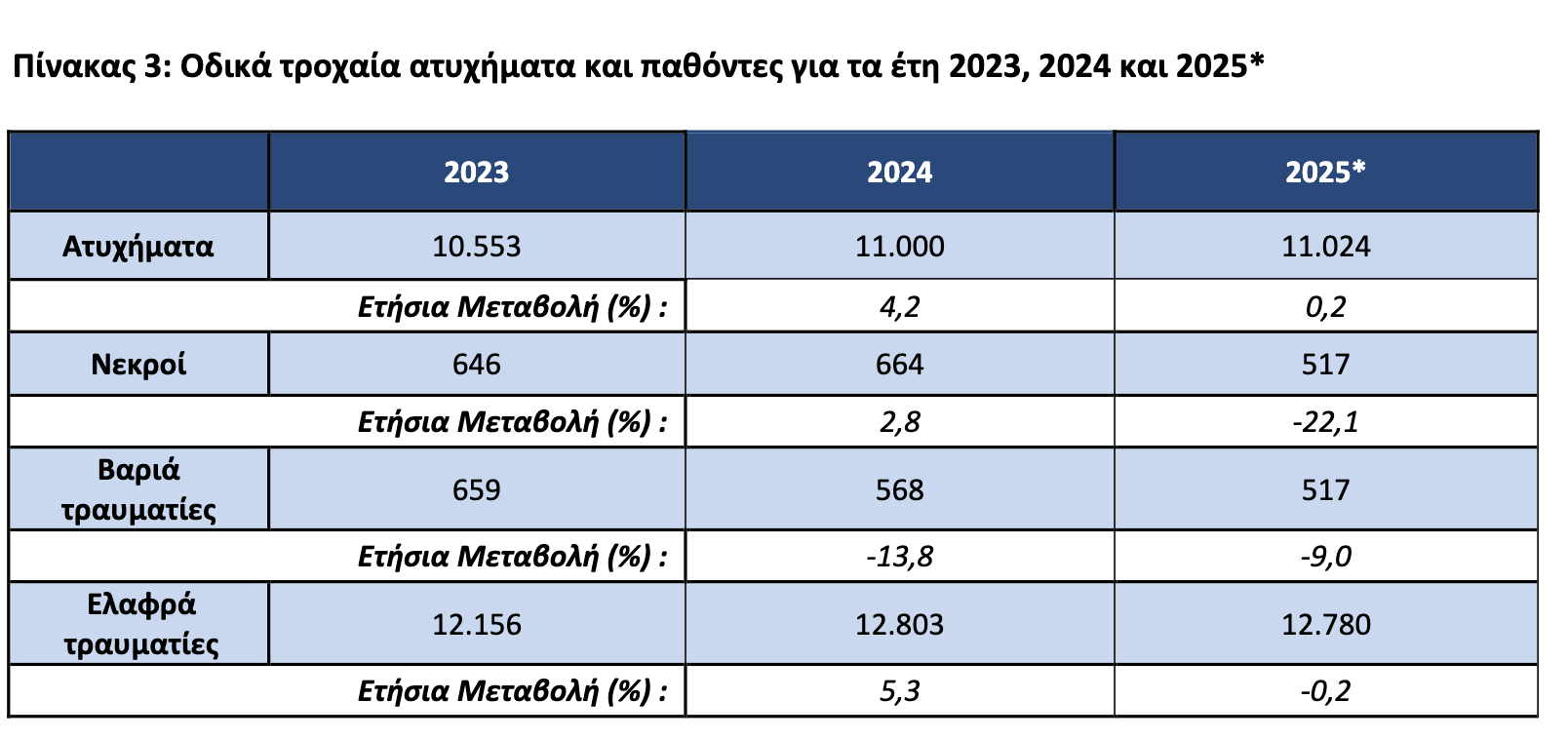 Όσον αφορά το σύνολο του 2025, τα προσωρινά στοιχεία της ΕΛΣΤΑΤ δείχνουν πως ενώ ο αριθμός των τροχαίων ατυχημάτων και των ελαφρά τραυματιών παρέμεινε σταθερός, μειώθηκαν σημαντικά οι νεκροί αλλά και οι βαριά τραυματίες. Πιο αναλυτικά, ο αριθμός των τροχαίων ατυχημάτων ανήλθε σε 11.024 από 11.000 το 2024 (+0,2%). Οι νεκροί ήταν 517, από 664 ένα χρόνο πριν (-22,1%), και οι βαριά τραυματίες 517 από 568 το 2024 (-9%). Τέλος, οι ελαφρά τραυματίες ήταν 12.780 από 12.803 το 2024 (-0,2%).