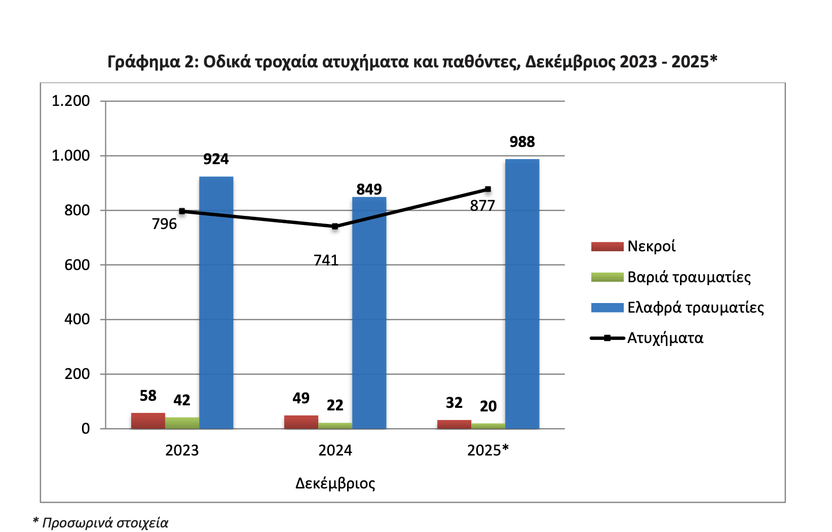 Σύμφωνα με τα προσωρινά στοιχεία της ΕΛΣΤΑΤ για το Δεκέμβριο του 2025, τα οδικά τροχαία ατυχήματα που συνέβησαν σε ολόκληρη τη χώρα που προκάλεσαν το θάνατο ή τον τραυματισμό ατόμων ήταν 877, αυξημένα κατά 18,4% σε σύγκριση με τον αντίστοιχο μήνα του 2024 (741 το Δεκέμβριο του 2024). Αύξηση καταγράφεται και σε σχέση με το Δεκέμβριο του 2023, όταν είχαν καταγραφεί 796 ατυχήματα.